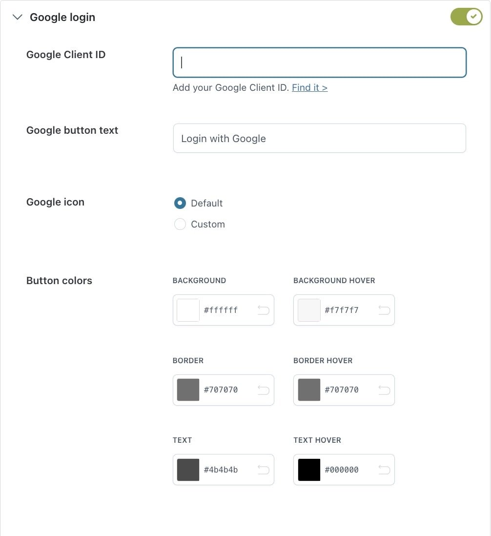 - Google button text: use this option to enter the text to show to users to log in through Google.