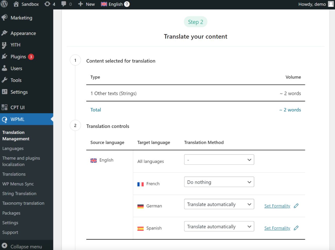 Once you select all your strings, the next step is to choose your translation method. To get the best translations, we recommend translating automatically using WPML’s most accurate AI translator – Private Translation Cloud (PTC).