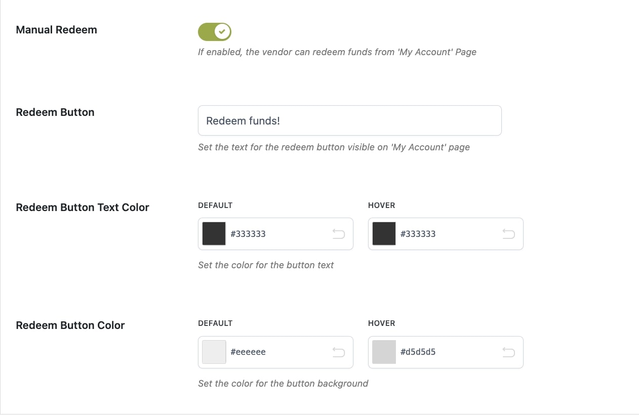 Manual Redeem: enable this option if you want to allow also manual redemption and submit a request from My Account. By enabling this option, you will also be able to customize the button text and colour.