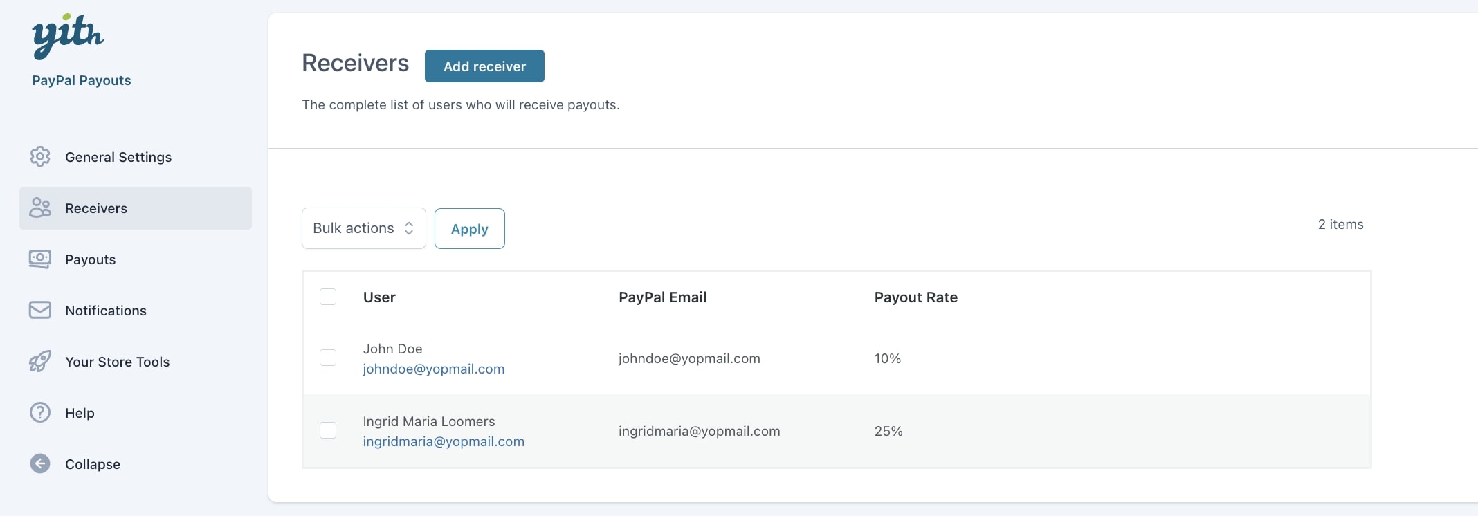 Note: if you’re using this plugin with either YITH Multi Vendor or YITH Affiliates, the plugin uses data retrieved from Affiliates and Multi Vendor to pay the payouts. Therefore, it is not necessary to add affiliates and vendors as receivers.