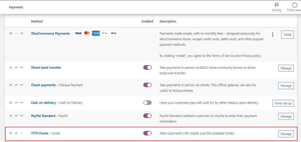 As soon as you activate the plugin, a new payment method called Funds will be made available among the WooCommerce payment gateways.