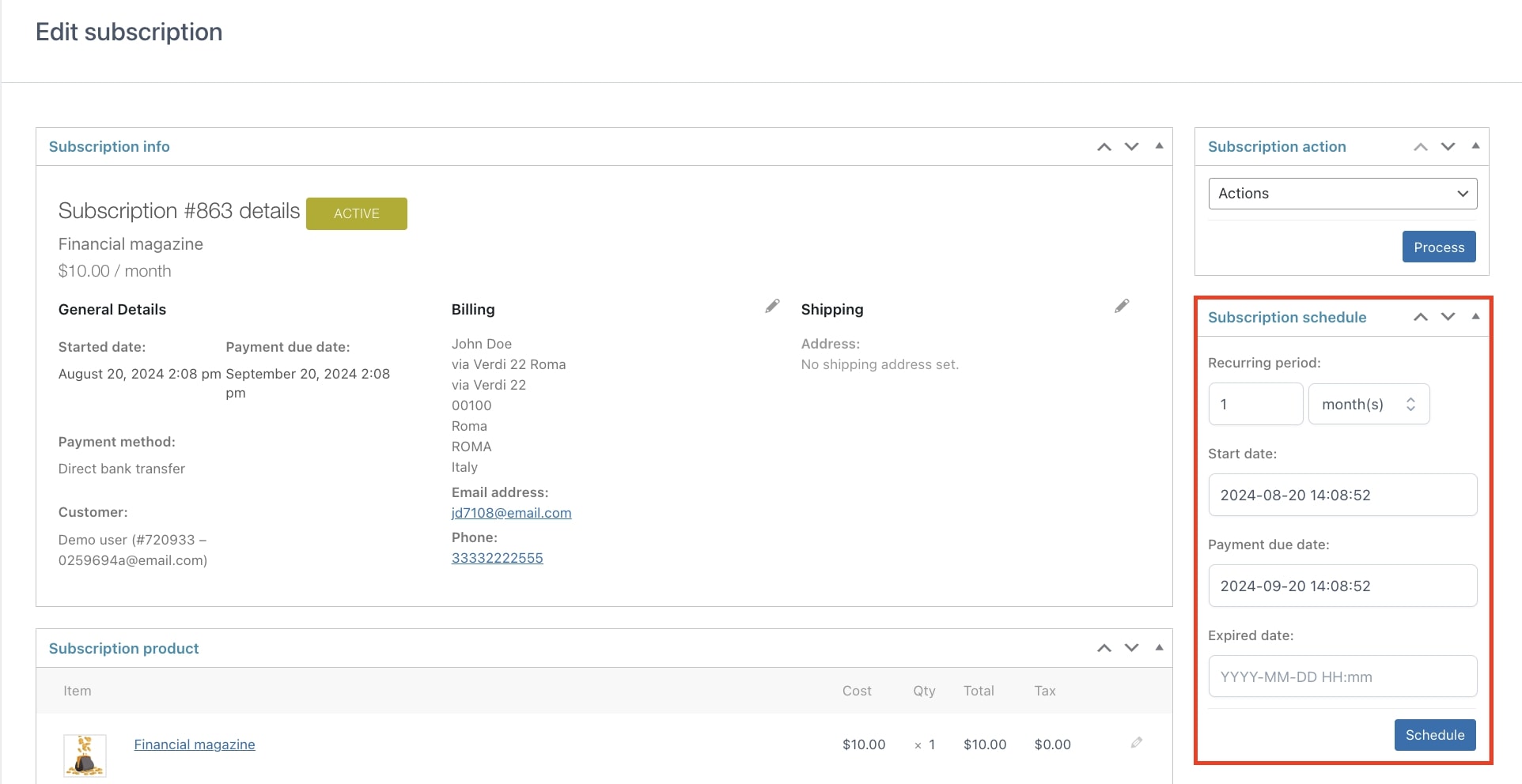 Start date: you can change the start date of the subscription. A note in the subscription details will keep track of this action. You will see a note with the following text: The start date has been changed from xx/xx/xxxx to xx/xx/xxxx.