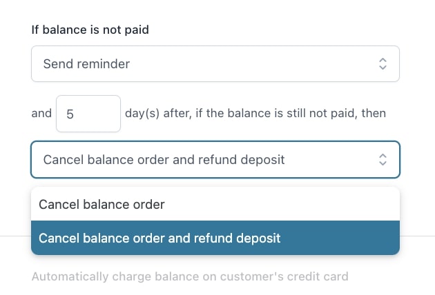 Regardless of when the payment of the balance order is required, you can choose to send a reminder email to customers to invite them to pay for the balance and set an expiration in days. If the balance order isn’t paid within the specified days, you can choose one of the following actions: