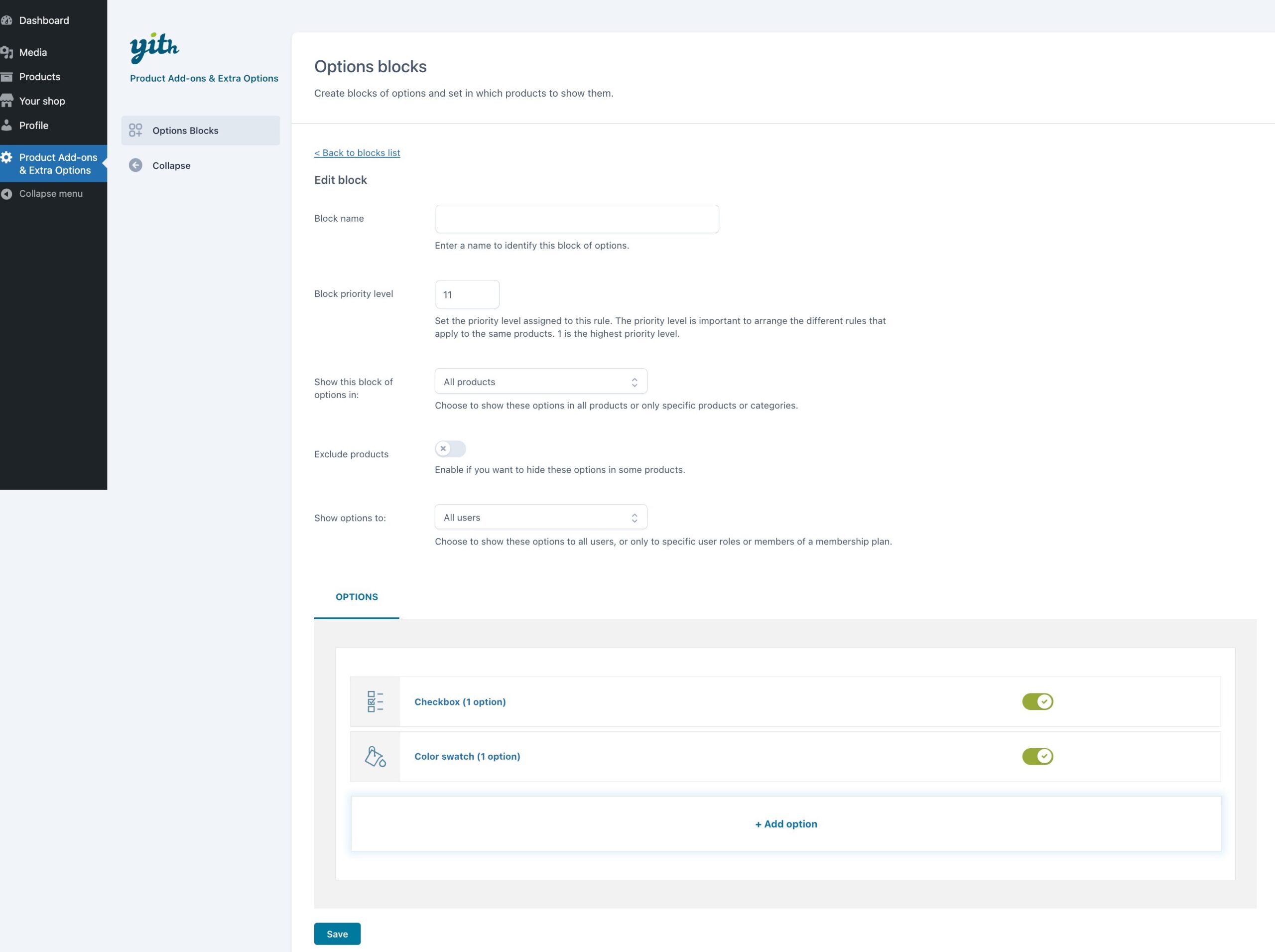 All vendors will be able to create their own options blocks from YITH > Product Add-ons panel:
