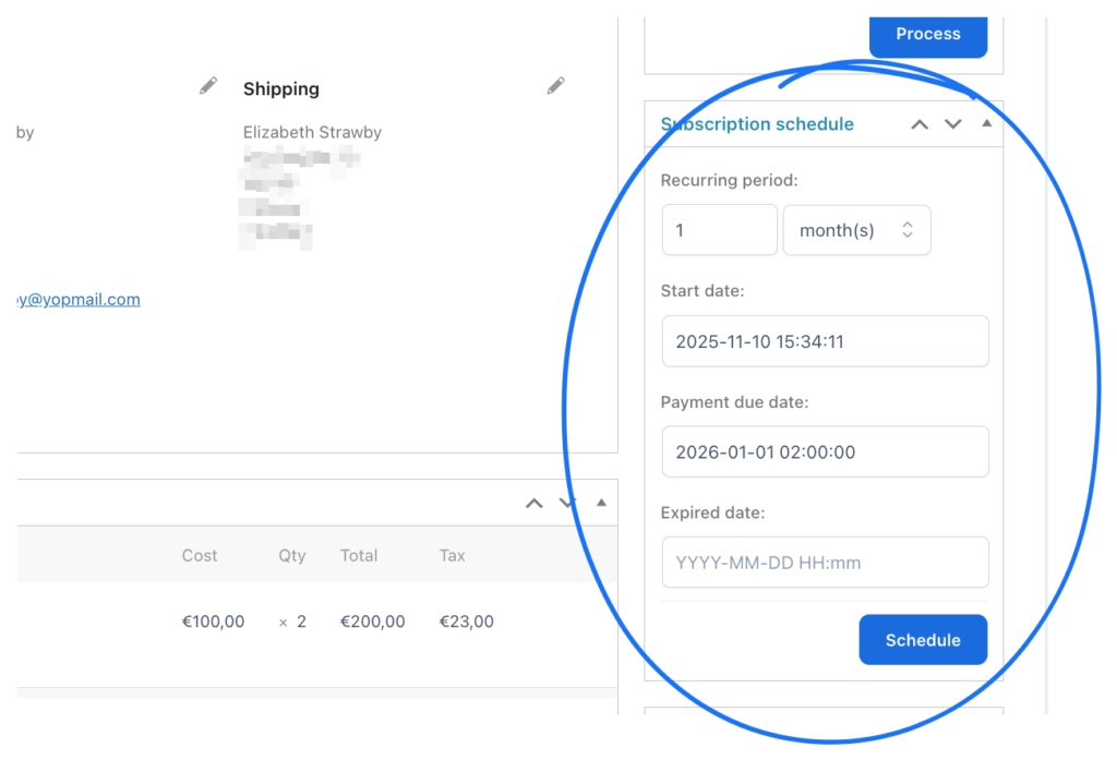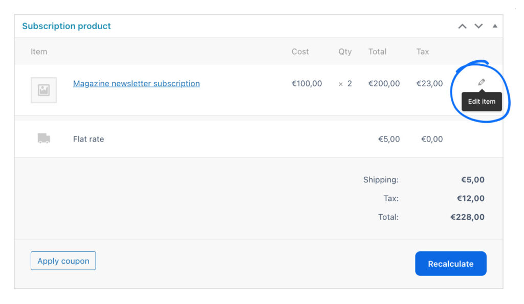 - From the Subscription product box, you can edit the amount: click on the pencil icon next to the subscription product and update quantity, total price and tax if available. Then Save.